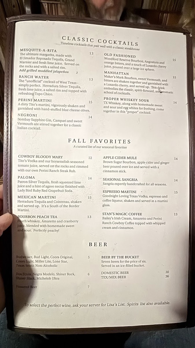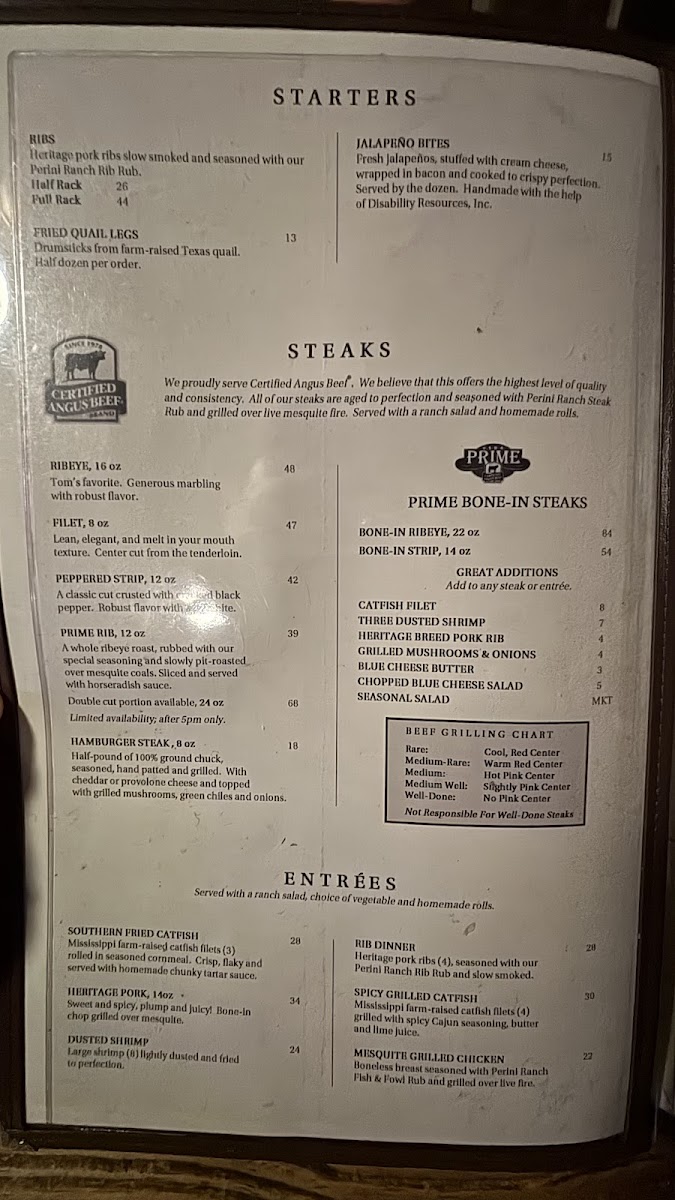 Located in Buffalo Gap, Texas, Perini Ranch Steakhouse offers a delightful culinary experience steeped in Southern charm. Their menu highlights include hearty starters like Quail Legs and juicy Ribs, setting the stage for a memorable dining experience. The stars, however, are the expertly prepared steaks, featuring Certified Angus Beef grilled over live mesquite, ensuring every bite delivers rich flavor and tenderness.